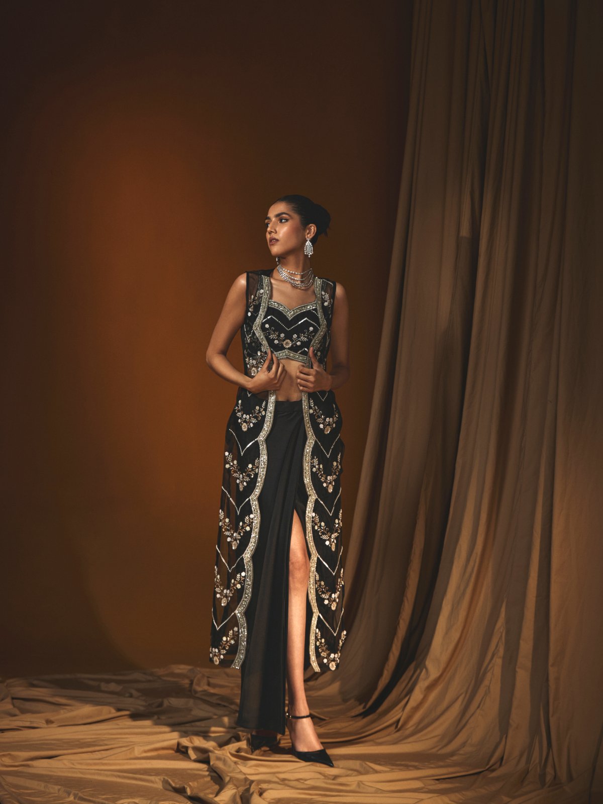 This Charcoal Black Set features a sleeveless blouse with a long sheer cape overlay, paired with a flowing drape skirt for a modern and dramatic silhouette. The blouse and cape are crafted in organza, while the skirt is made from satin, offering a graceful and light finish. With clean lines, subtle shimmer and a contemporary edge, this ensemble is ideal for evening receptions, cocktail affairs or fashion-forward wedding events. Dry clean only to retain the fabric’s sheen and structure.