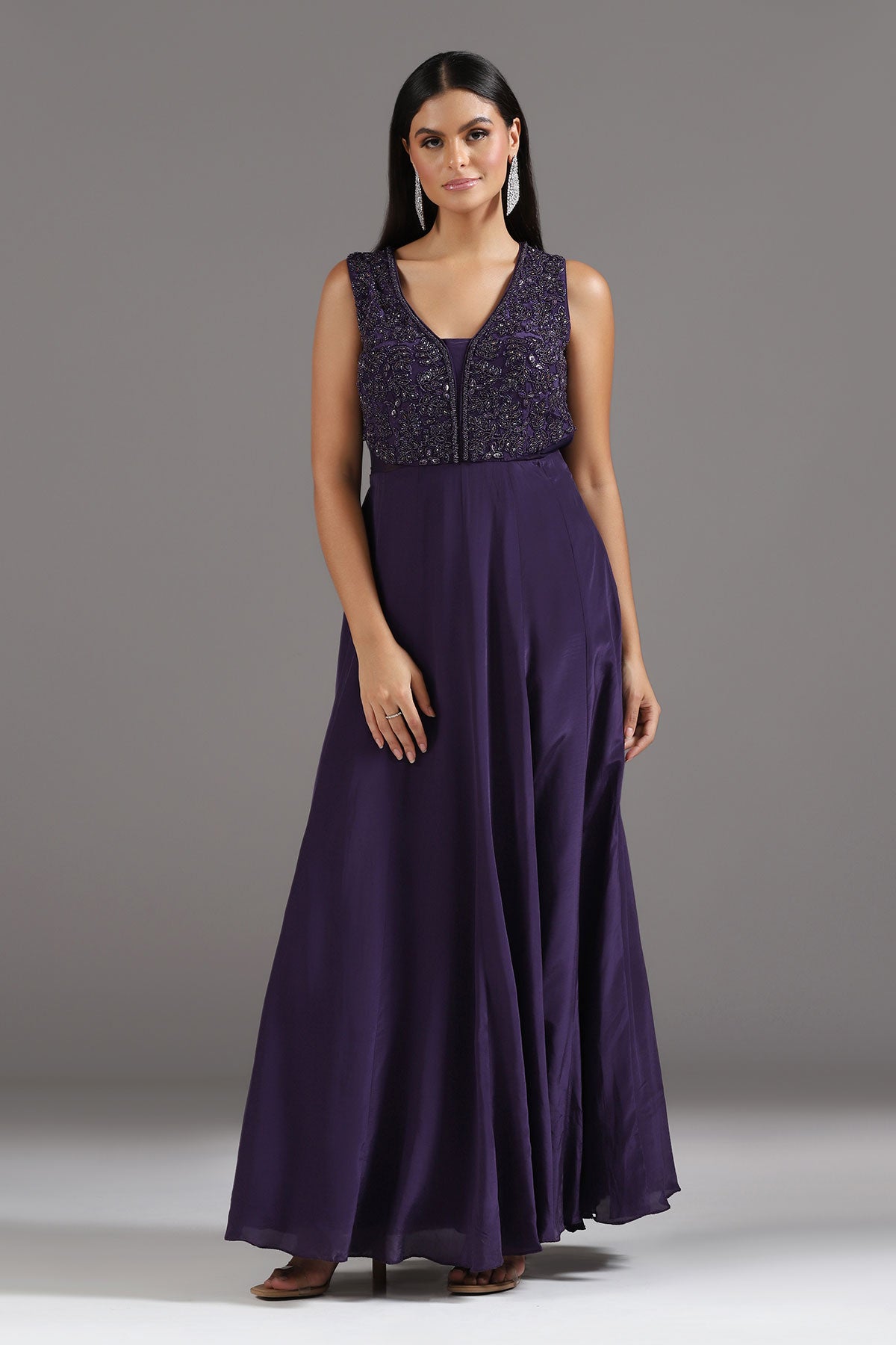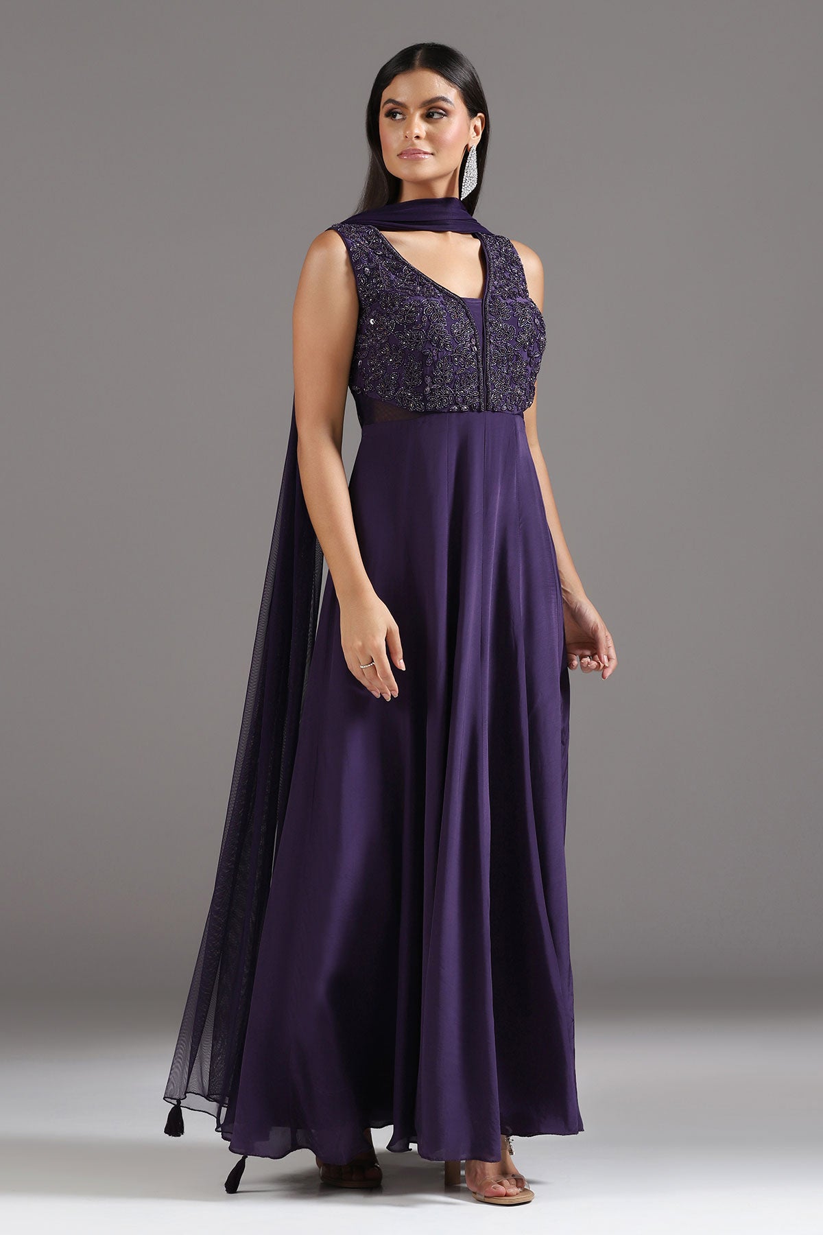 Step Into Elegance With This Stunning Deep Purple Anarkali, Tailored From Premium Crepe Fabric. The Yoke Features Intricate Cut Dana Hand Done Embroidery. The Embroidery Is Western In Sensibility Making The Ensemble Suitable For All Types Of Evenings Soirees. The Back Is Beautifully Covered With Soft Net And Embellished With Scattered Sequin Work, Adding A Subtle Shimmer. The Outfit Is Completed With A Matching Net Dupatta Finished With Thread Tasseling On The Corners, Lending A Graceful And Feminine Touch. A Perfect Blend Of Sophistication And Fine Craftsmanship, Ideal For Formal Dinner Gatherings And Light Wedding Functions Alike.