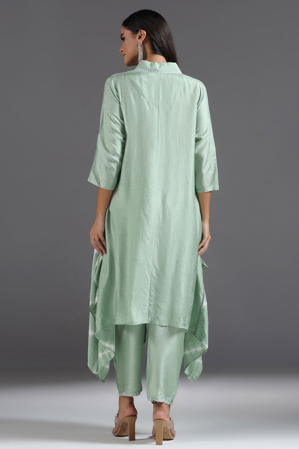 Graceful And Modern, This Green Kurta Set Is Crafted In Soft Silk Fabric And Features A Stylish Shirt Collar And A Flowing Silhouette. The Kurta Is Elevated With Traditional Leheriya Printed Side Panels That Add Movement And Cultural Charm. The Shirt-Style Collar, Button Placket, And Pant Hem Are Delicately Highlighted With Fine Thread Embroidery, Adding Subtle Yet Elegant Detailing To The Ensemble. The Kurta’S Asymmetrical Hemline And Relaxed Side Drape Bring A Contemporary Edge, While The Straight-Fit Pants Complete The Look With Clean Structure And Minimal Design. Perfect For Festive Day Events, Family Gatherings, Or Cultural Celebrations, This Set Beautifully Merges Traditional Craft With Refined Tailoring.