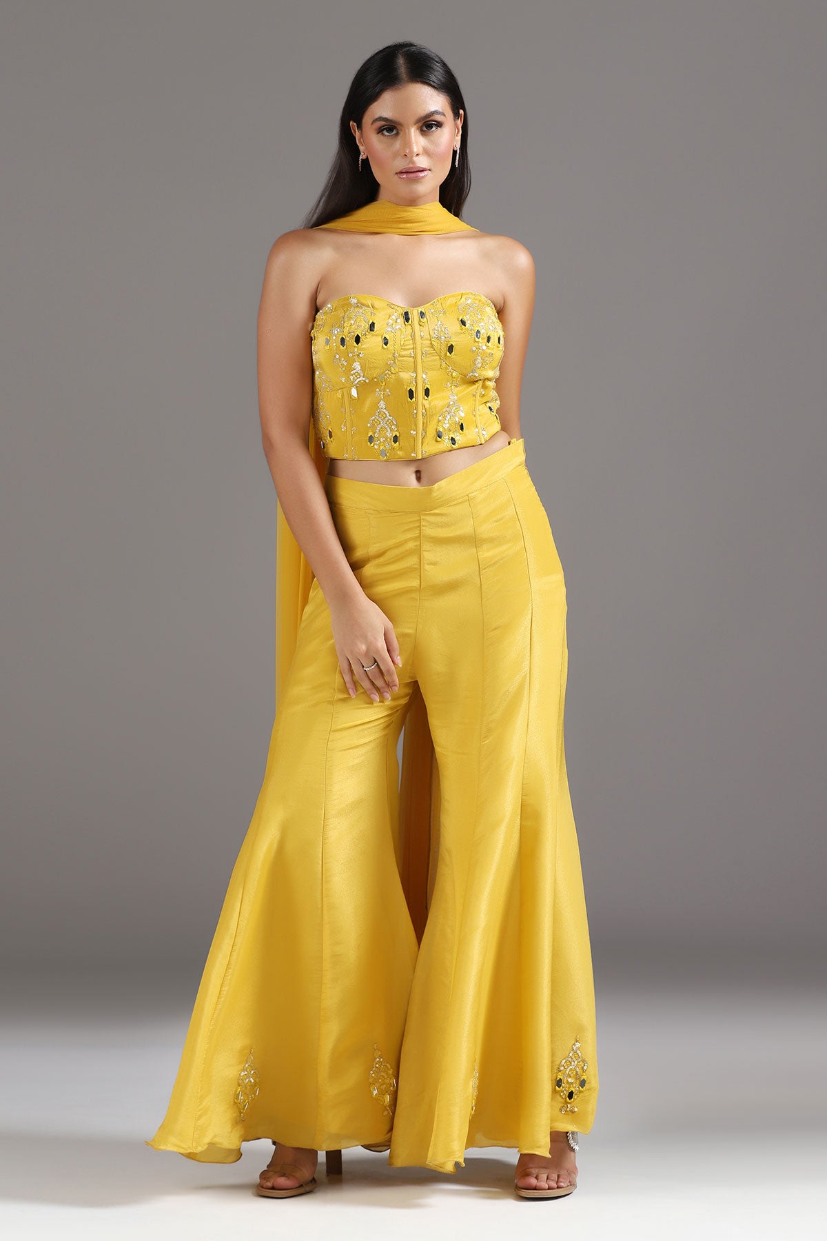 This Chic Haldi Yellow Corset Set, With Its Beautifully Structured Strapless Corset Blouse Made From Rich Tissue Fabric, Is Perfect For Making A Statement. This Blouse Features Exquisite Mirrors, Sequins, And Resham Embroidery That Add A Luxurious Touch To Your Festive Wardrobe. The Silhouette Strikes A Balance Between Kraft And Comfort When Paired With Flared, High-Waisted Tissue Sharara Pants Embellished With Subtle Mirror Work Motifs Near The Hem. The Ensemble Is Completed With A Soft Net Dupatta, Adorned With Intricate Mirror Embroidery To Elevate The Overall Appearance. This Ensemble Is Perfect For Wedding Events, Sangeet , Engagements, Or Festive Parties, Seamlessly Merging Modern Style With Traditional Allure. It Is Very Comfortable To Wear The Adjustable Tie-Up Back, Which Also Allows For Size Adjustments Without Alterations.