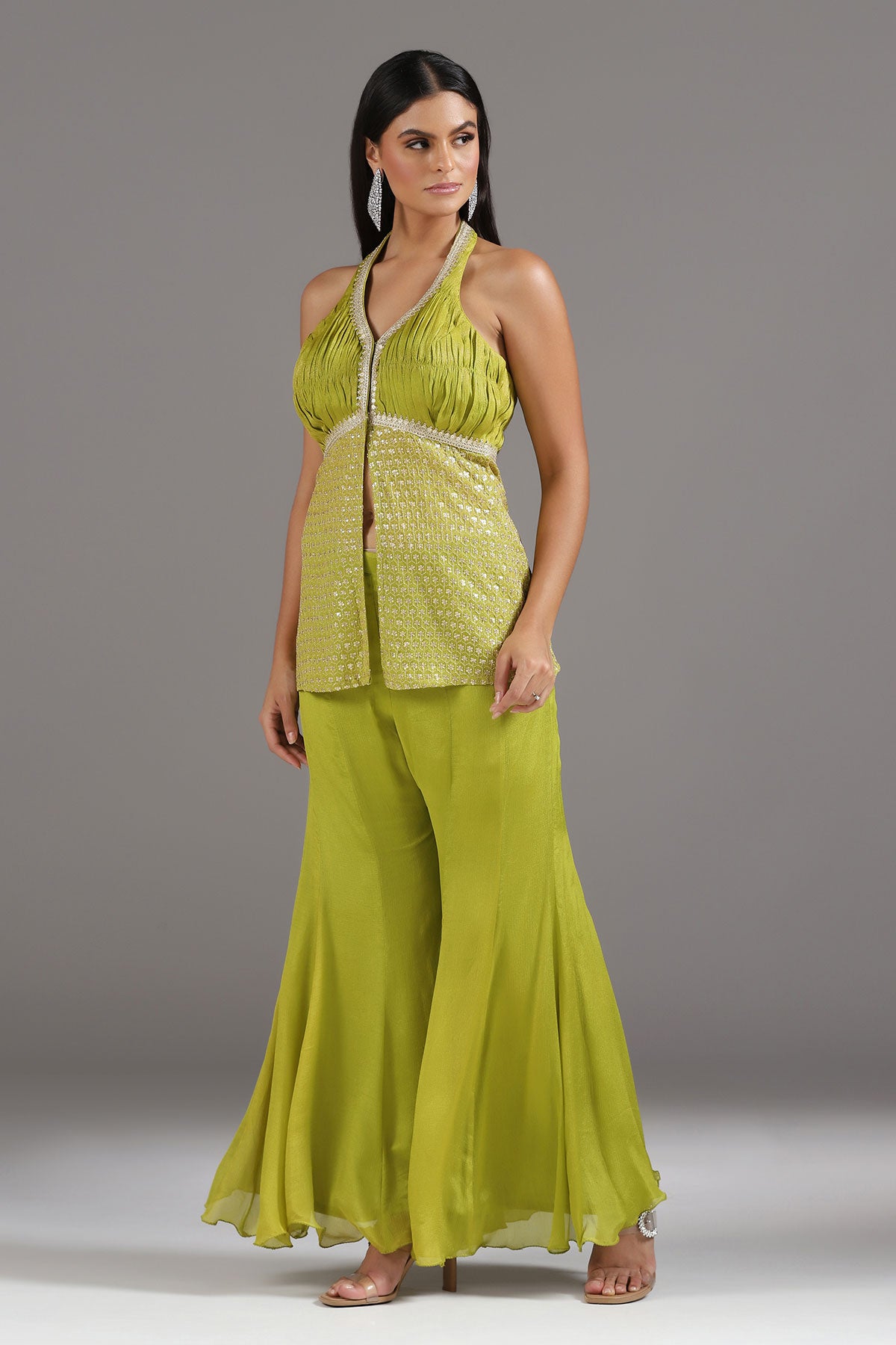 Elevate Your Festive Wardrobe With This Trendy Number In Irresistible Lime Green Georgette. The Tunic Which Is A Halter Neck Has A Textured Bodice With Fine Rouching And Is Sitting Atop A Delicately Embroidered Front Opening Tunic In Soft Gold Sequins. The Tunic Has A Low Back. The Outfit Has Detailing Along The Neckline And Front Border Which Is Adorned With Intricate Sequin And Zari Embroidery, While The Lower Half Of The Jacket Showcases All-Over Shimmering Sequin Work. Complementing The Jacket Style Tunic Is A Beautifully Flared Chiffon Bell Bottom Trouser That Flows With Effortless Ease. The Look Is Completed With A Soft Net Dupatta, Delicately Embellished To Add A Touch Of Grace And Balance To The Ensemble. Perfect For Weddings, Mehendi Functions, Or Evening Festivities, This Set Is Perfect For All Ages And Especially When You Hit The Dance Floor.