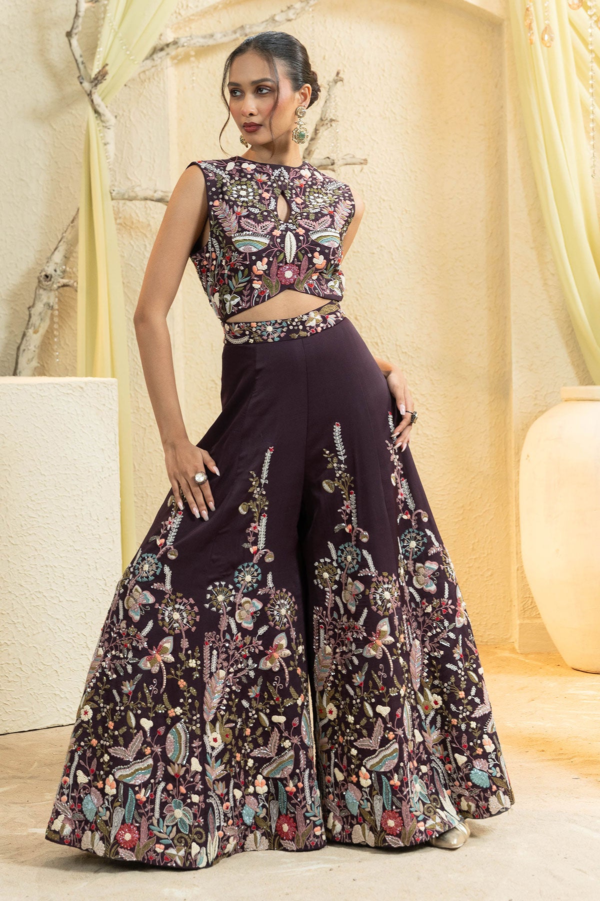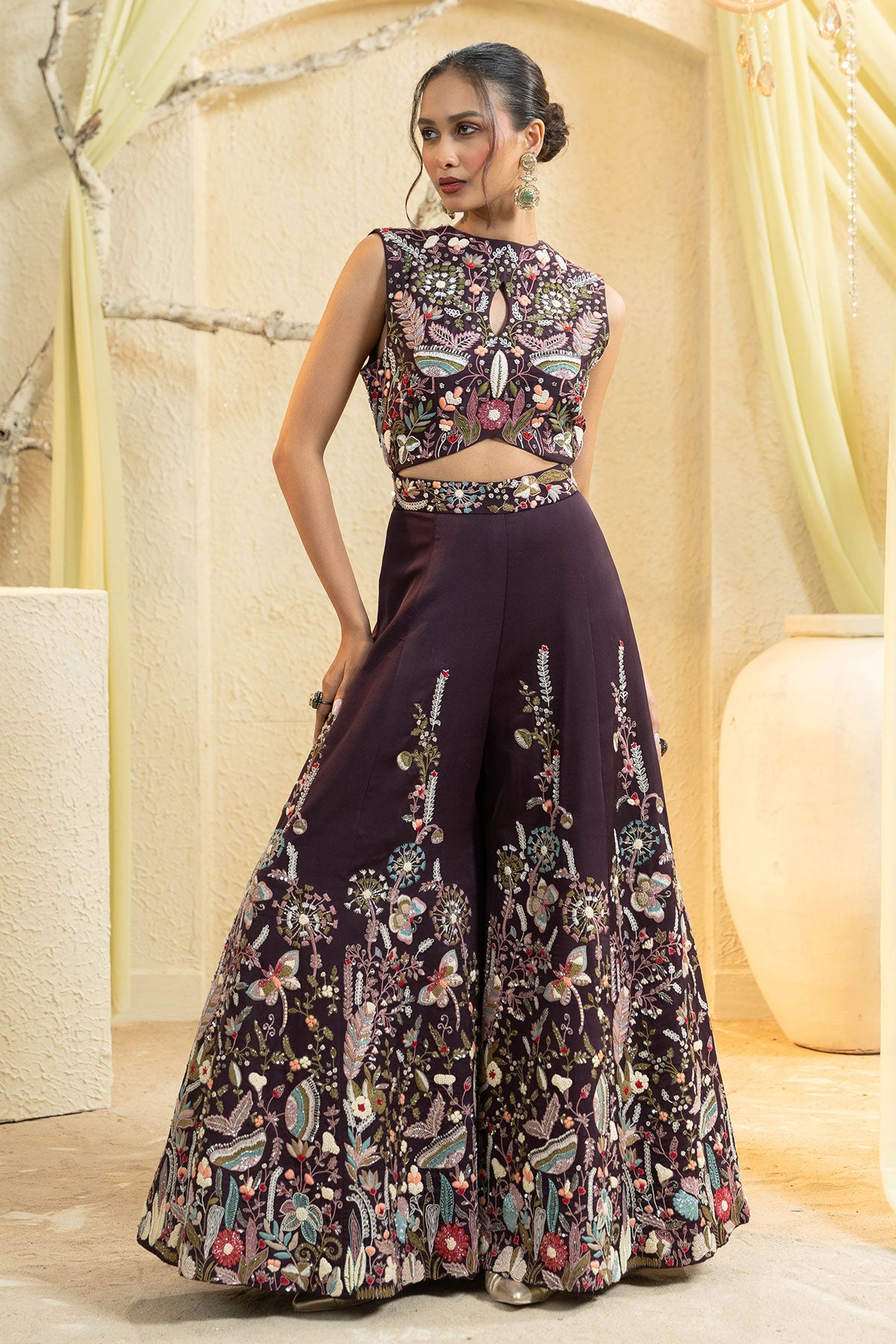 The Maroon Muse Hand-Embroidered Jumpsuit Is A Sophisticated Embodiment Of Modern Elegance, Elevated By Exquisite Artisanal Craftsmanship. Featuring A Tailored Silhouette And Adorned With Intricate Hand Embroidery, This Ensemble Seamlessly Blends Contemporary Design With Timeless Tradition. The Rich Maroon Hue Adds Depth And Distinction, Making It An Impeccable Choice For Evening Affairs, Festive Celebrations, And Statement Occasions Where Effortless Glamour Is Essential.