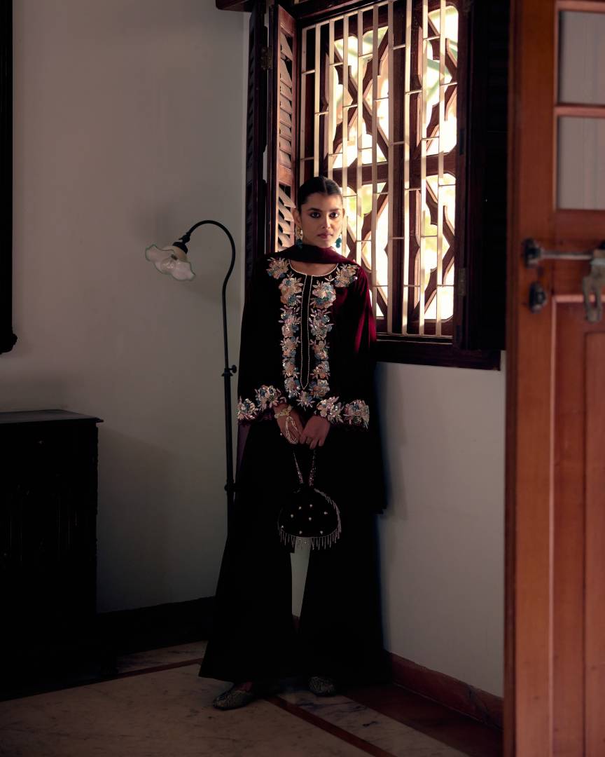 Make a statement in this luxurious deep maroon velvet ensemble. The relaxed short kurta features stunning multicolor floral embroidery with pearls and round sequins adorning the neckline panel and sleeves. Crafted in rich velvet with no lining and hook closure detailing, it pairs beautifully with dramatic kalidar bell bottom pants. The elegant net dupatta showcases pearl and velvet finishing. Includes a matching embroidered potli with pearl tassels for complete sophistication.