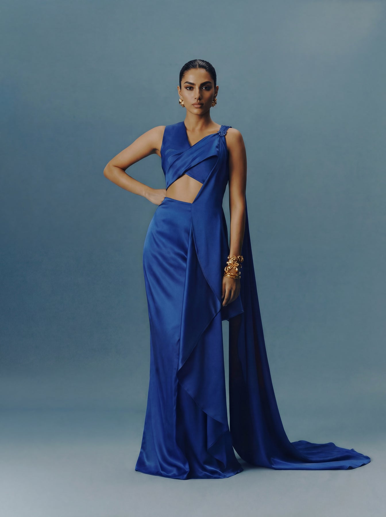 The pre-draped saree features luxurious satin silk with elegant ruffled detailing and a dramatic trailing pallu. Paired with a striking asymmetric sleeveless blouse showcasing a bold cutout design and geometric embellished brooch on the shoulder with cut-dana and pearl work. This contemporary interpretation of the classic saree combines architectural draping with modern glamour, perfect for making an unforgettable statement.