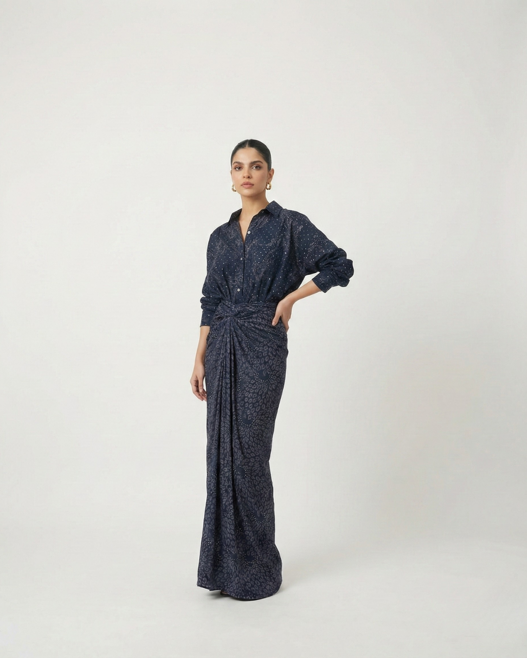 The relaxed collared shirt features all-over scattered sequin embellishment creating subtle shimmer. Crafted in flowing crepe with a button-front closure and comfortable fit. Paired with a stunning pleated wrap skirt in matching navy with leopard-inspired print and coordinating sequin detailing. This contemporary two-piece co-ord set with thread work and patra embellishments combines modern tailoring with festive glamour.