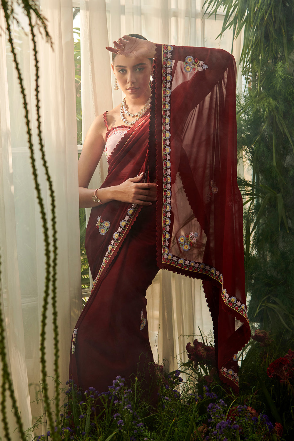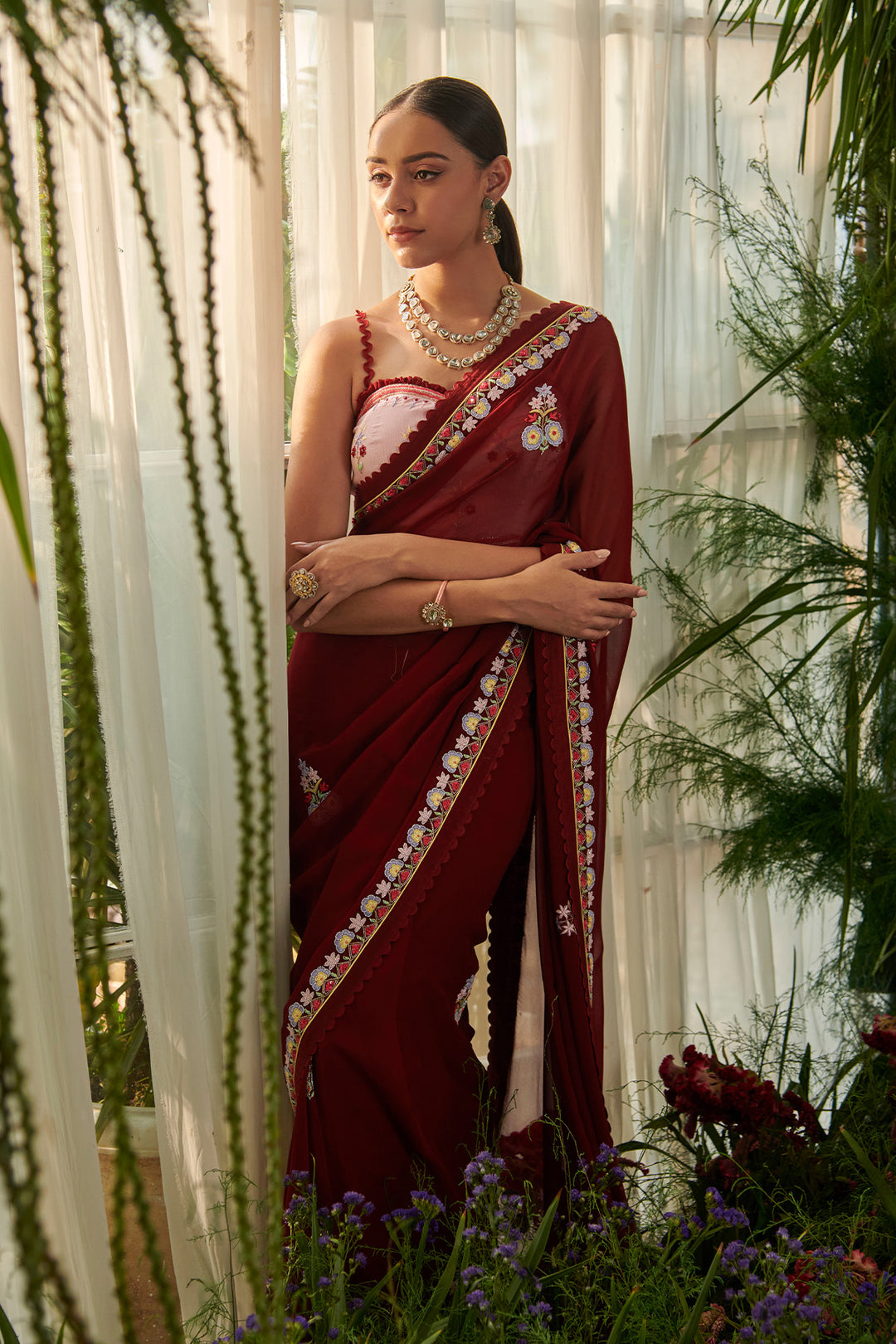 Maroon Drape Saree with Monotonal Embroidered Blouse