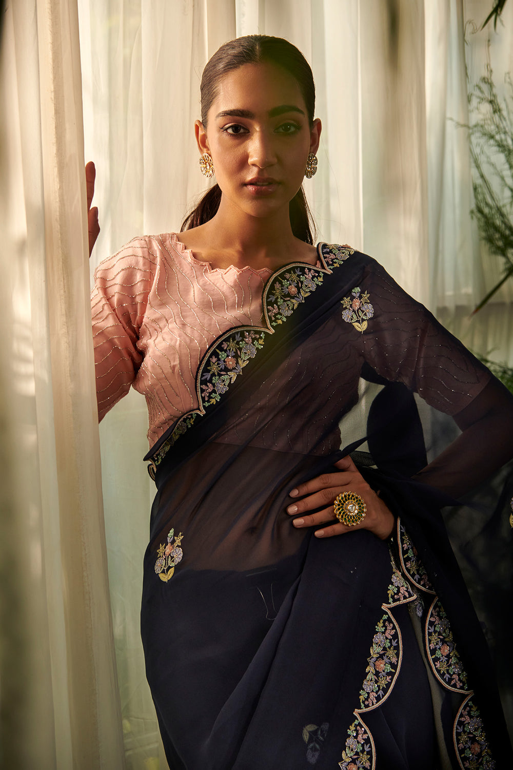 Black and Gold Drape Saree with Hand Embroidered Blouse