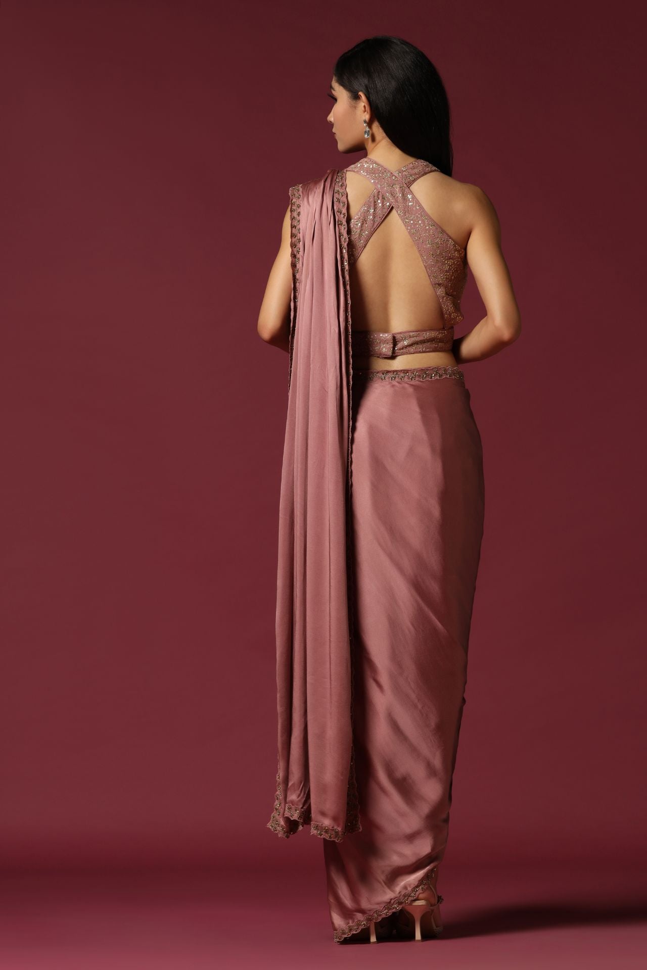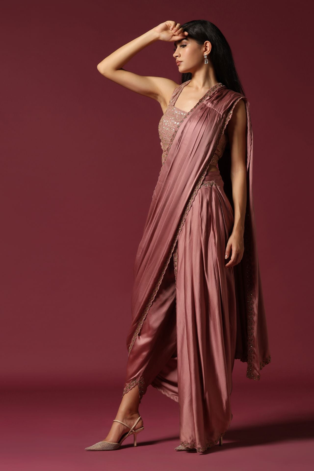 Featuring a dusty pink dhoti saree in a luxurious satin base with sequins and zari work. It is paired with a matching georgette blouse having gold sequins work.