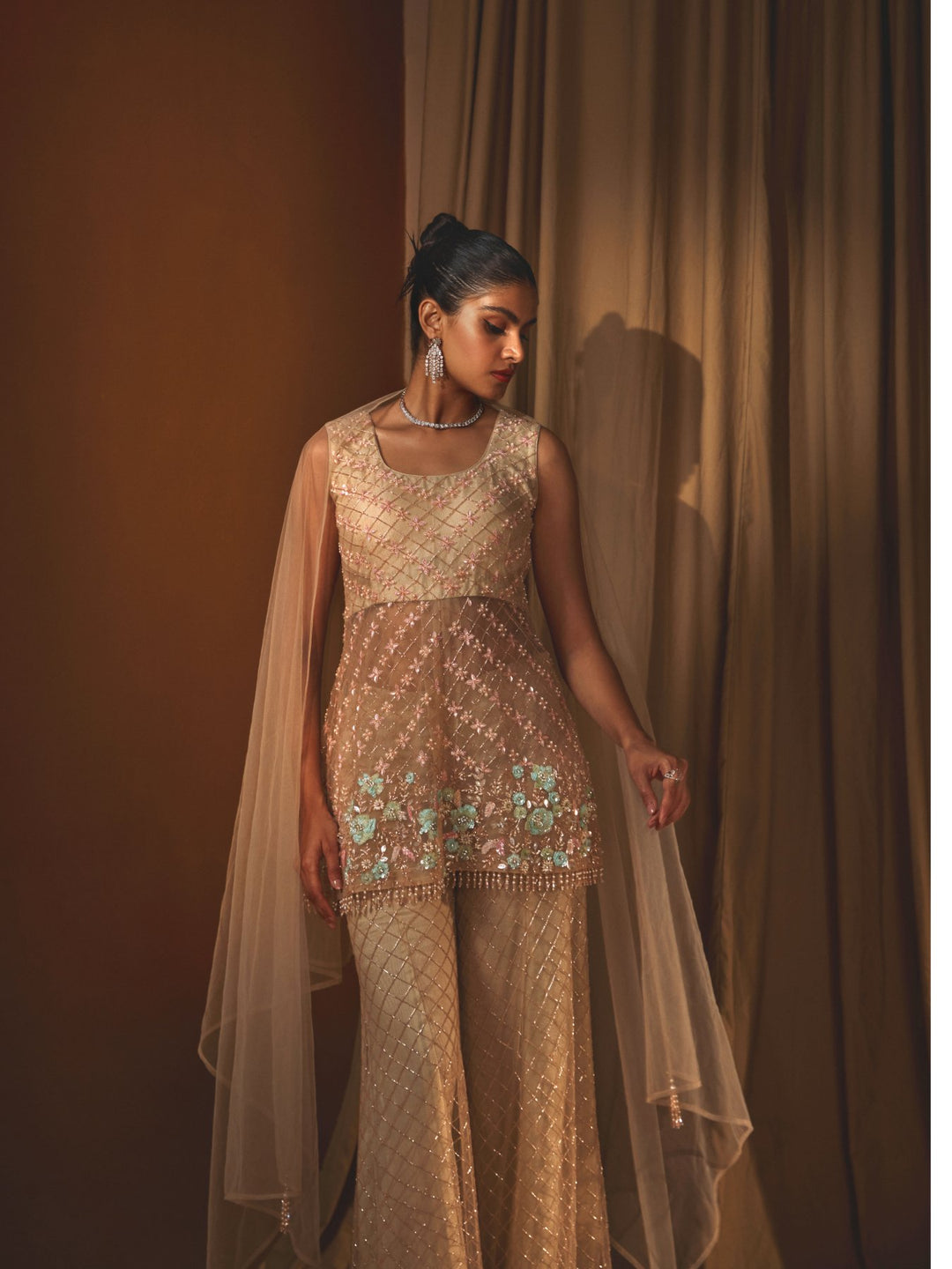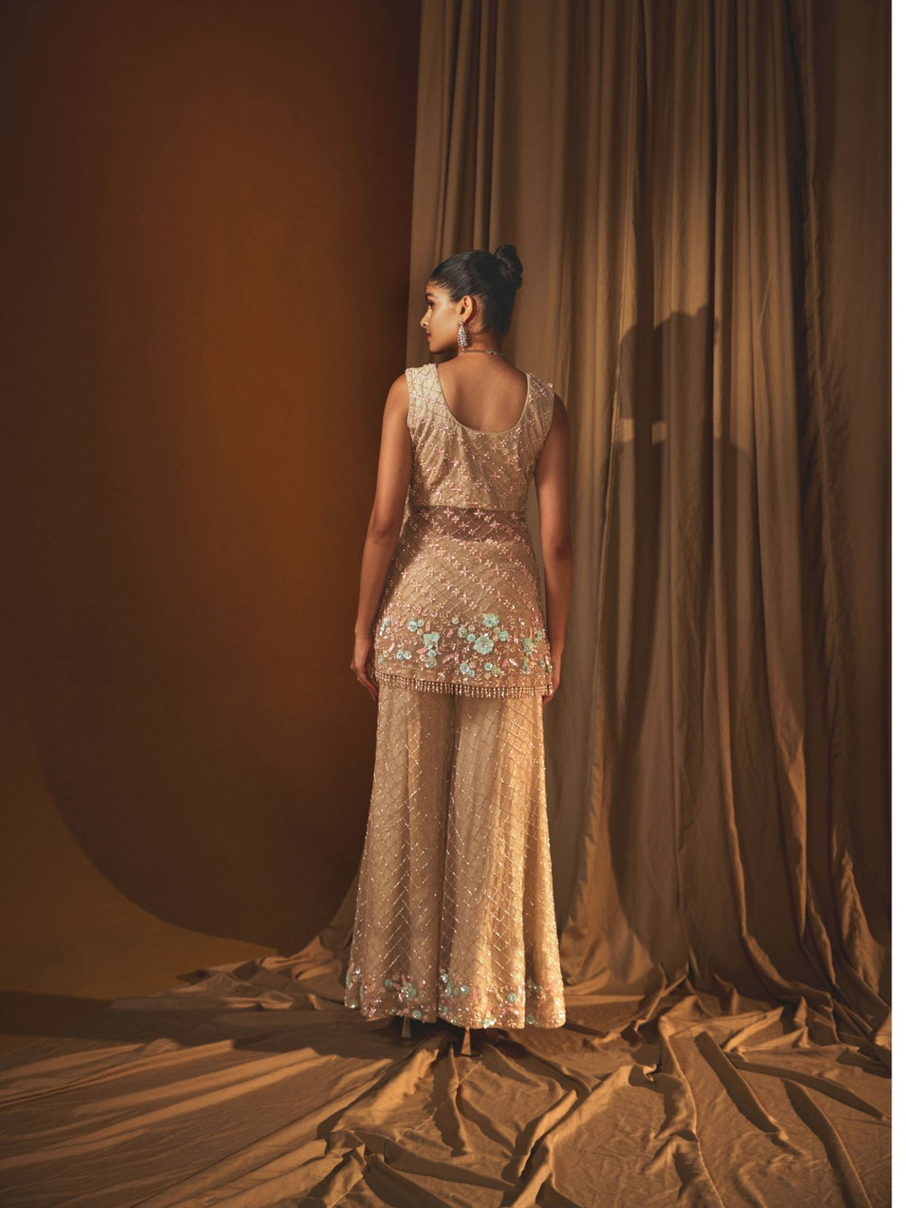 GOLD EMBROIDERED SHORT TISSUE KURTA WITH SHARARA SET