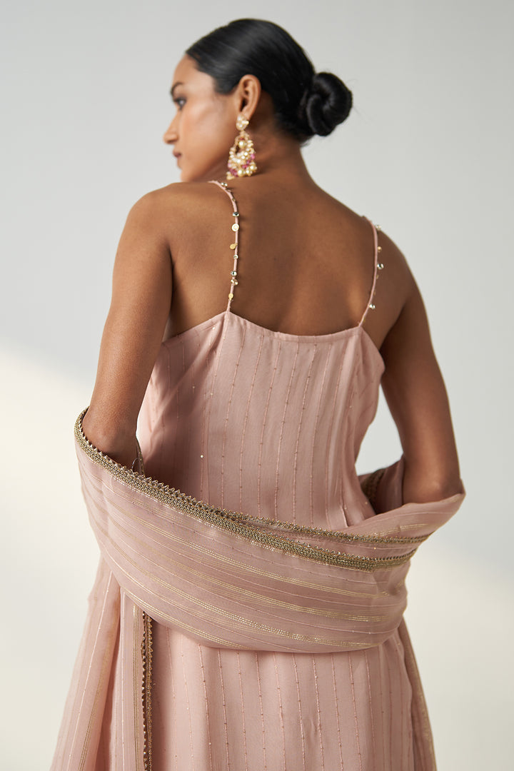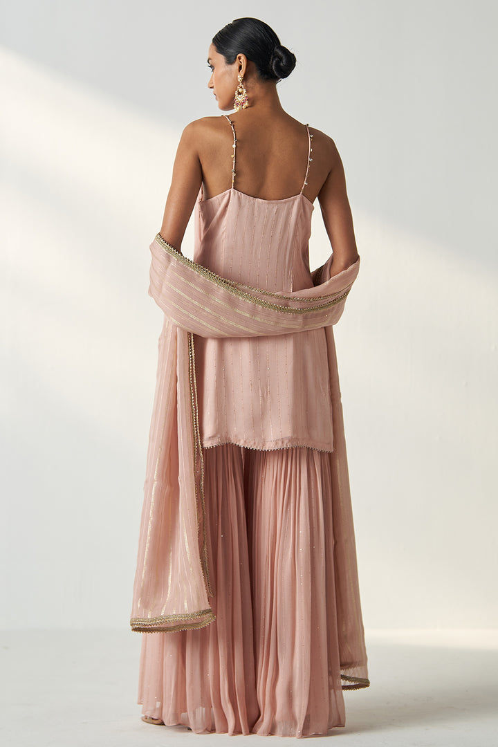 This Elegant Blush Pink Kurta Sharara Set Features A Short Kurta With Delicate Ghungroo And Tassel Detailing On The Straps. The Hem Is Adorned With Intricate Gota Work, Adding A Subtle Shimmer. The Sharara And Kurta Are Crafted From Georgette Fabric, Offering A Soft, Flowy Silhouette. The Organza Dupatta Is Beautifully Designed With Gota Detailing, Golden Lace, Sequins, And Fine Thread Embroidery, Giving It A Refined Finish. This Ensemble Is A Perfect Blend Of Traditional Elegance And Modern Sophistication, Ideal For Festive And Special Occasions.