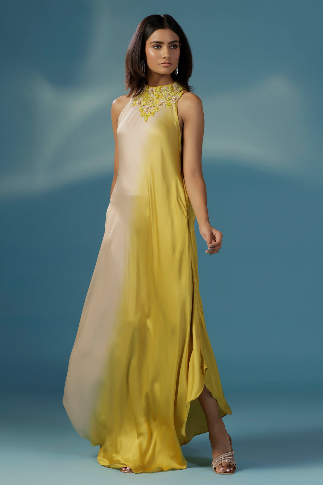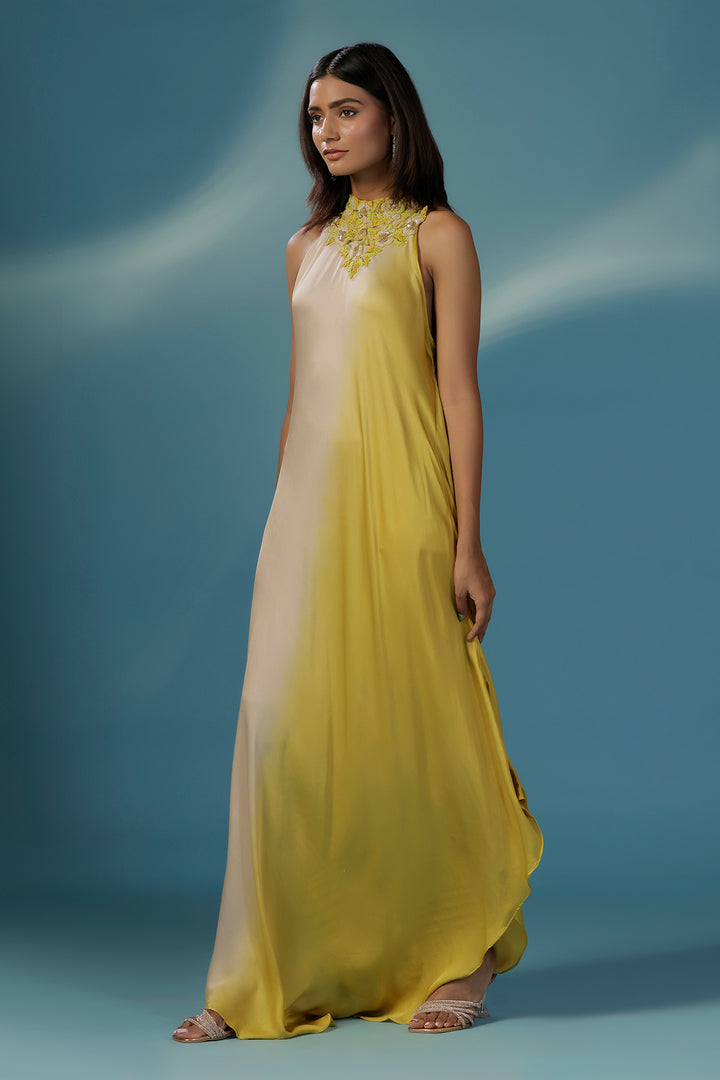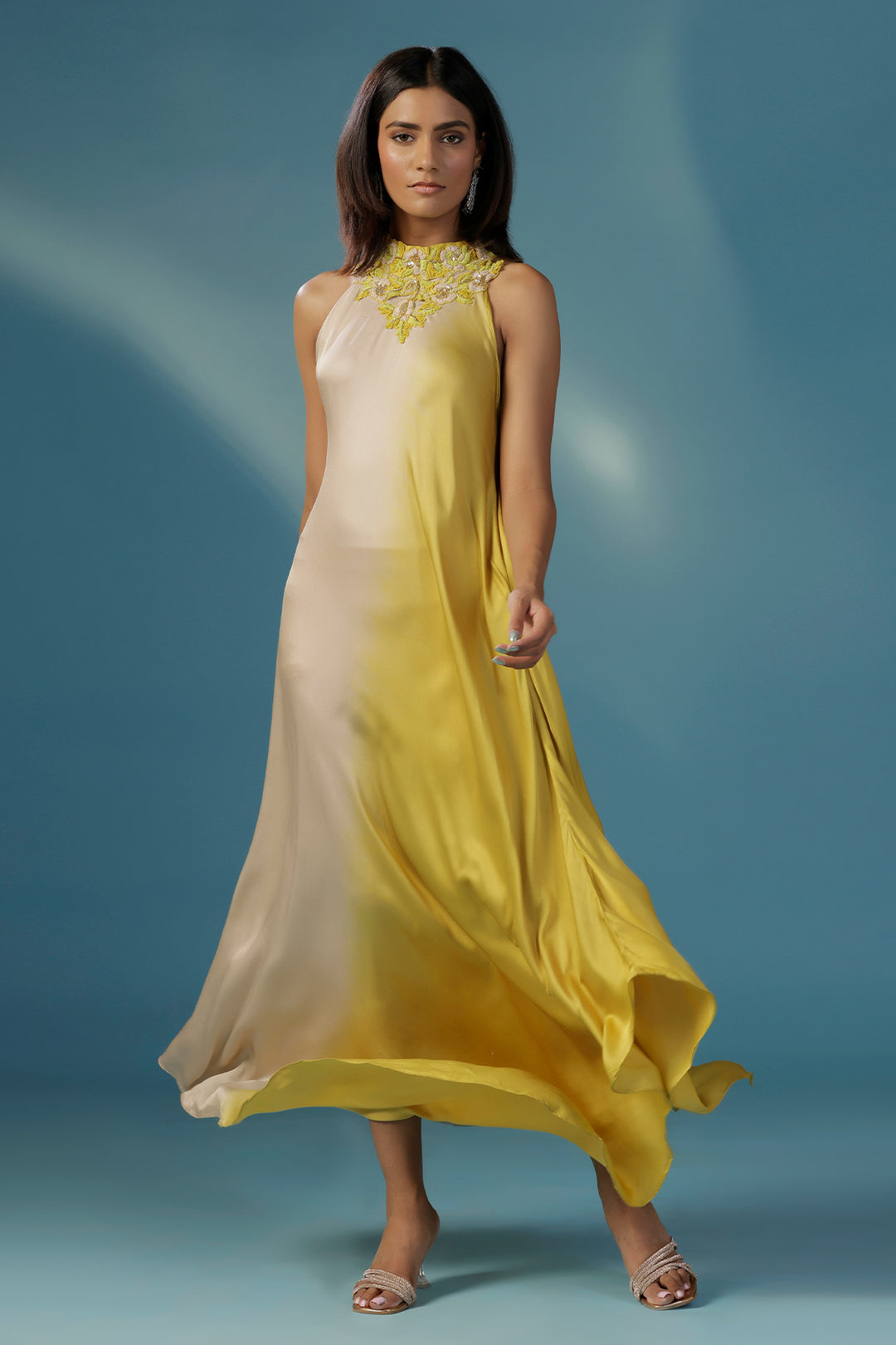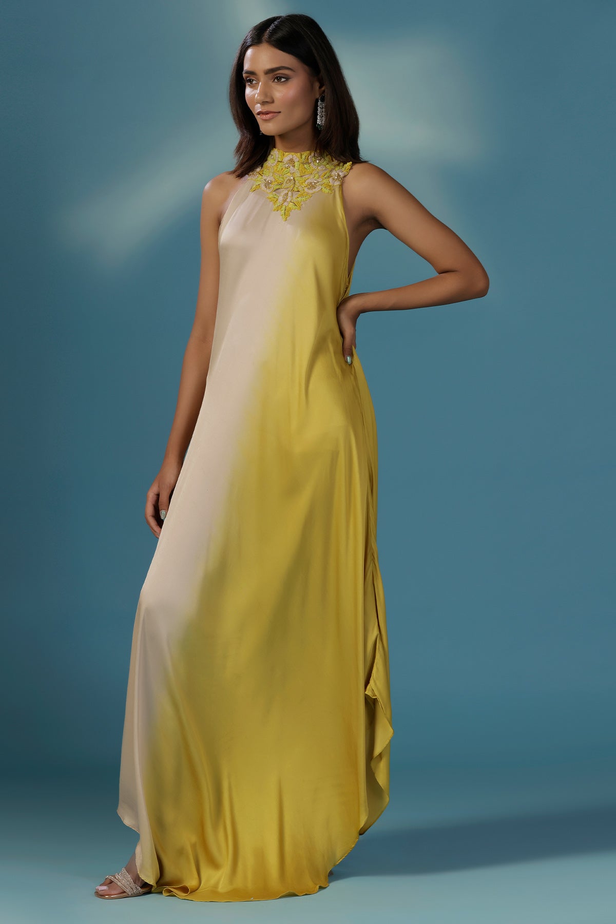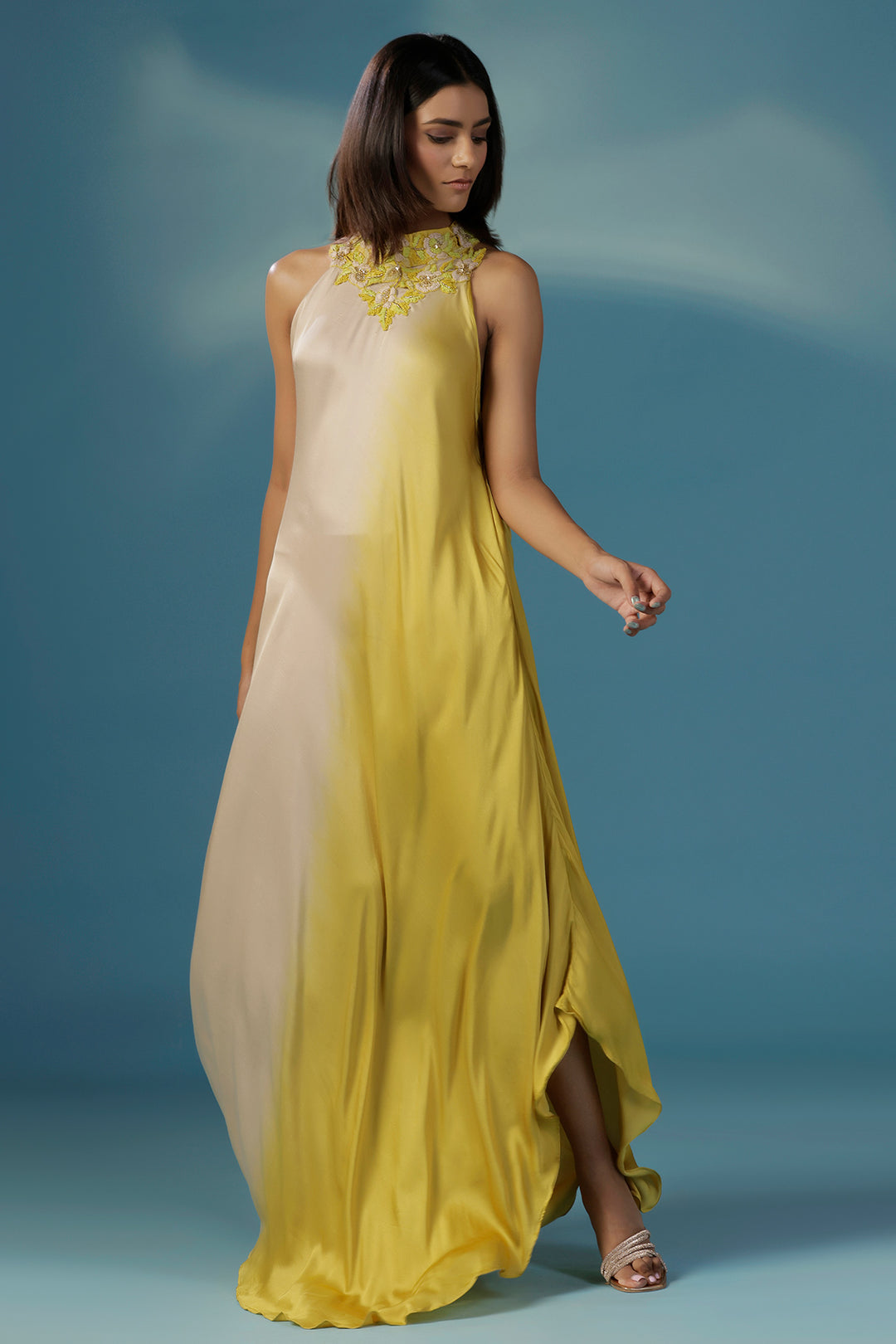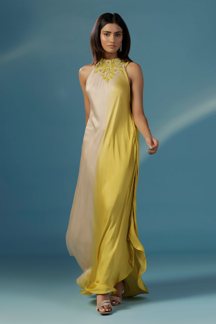 Grace meets glamour in this beautiful double-shade long dress, blending rich hues of yellow and grey. Crafted from plush satin fabric, this sleeveless dress features a high sculptured neck that stands out with its delicately done resham work. The handkerchief cut of the dress gives it an interesting flow at the bottom.