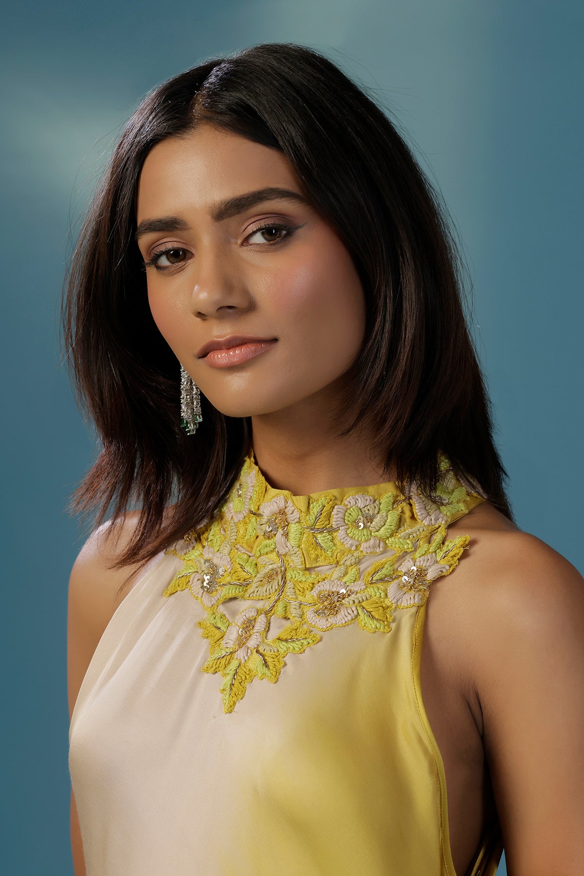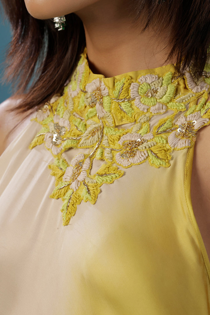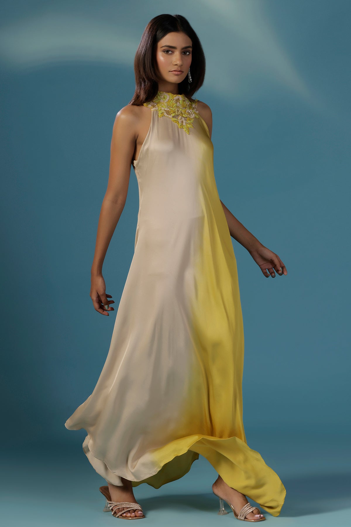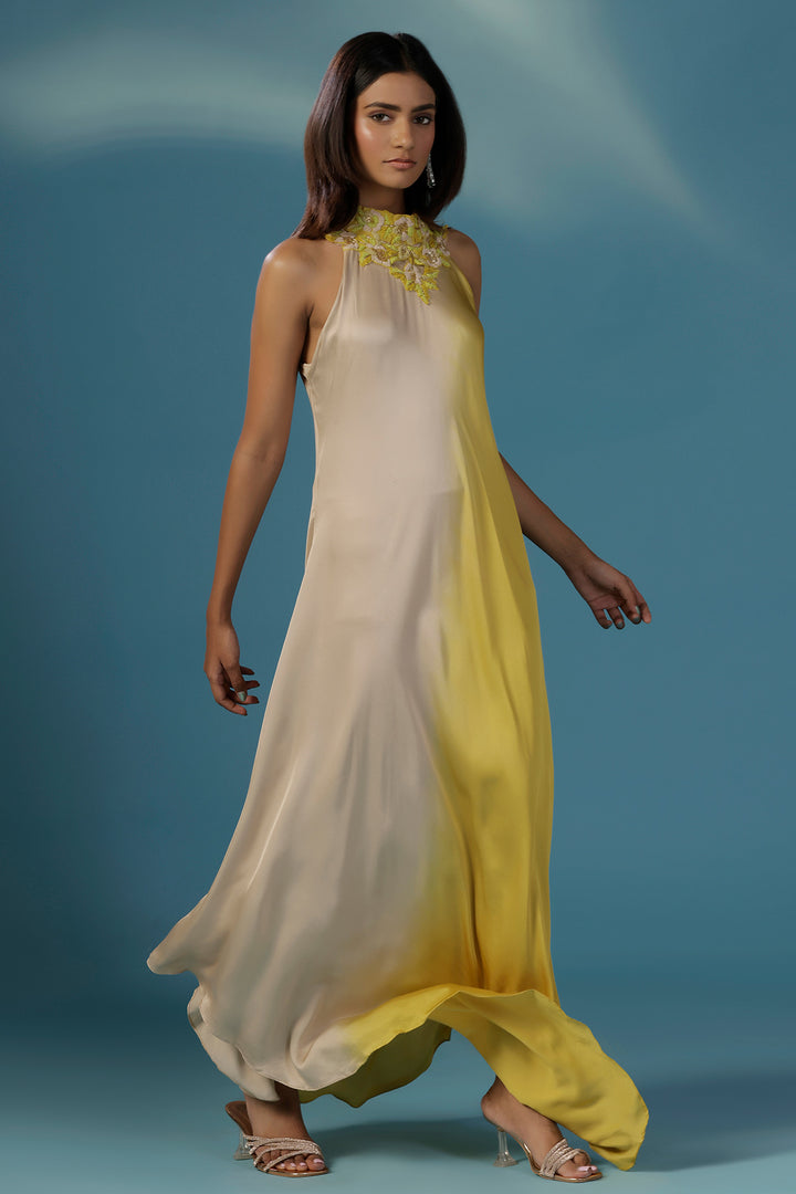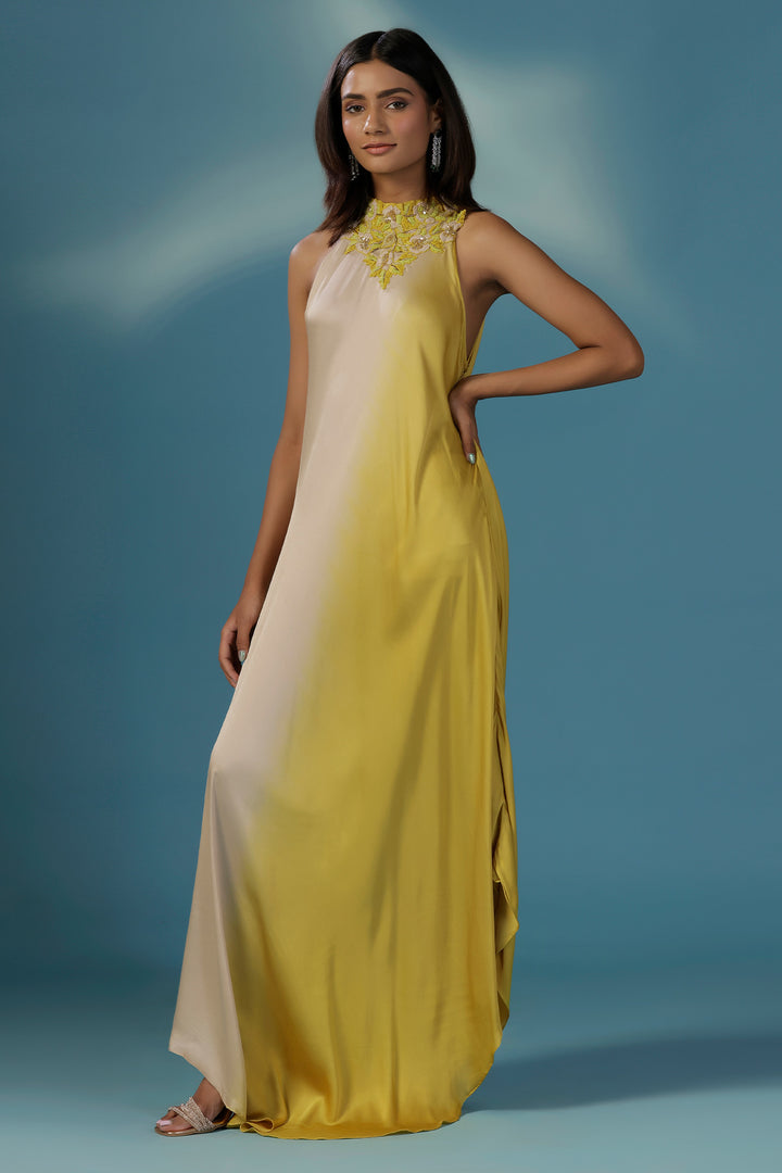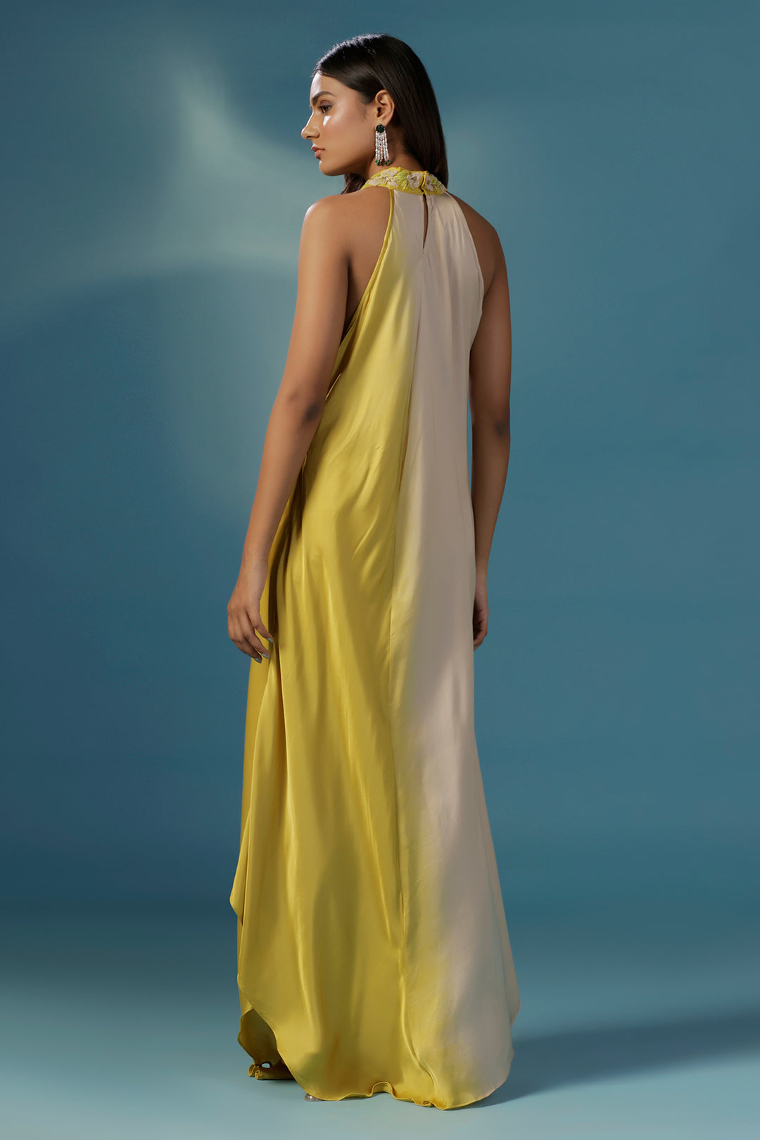 Grace meets glamour in this beautiful double-shade long dress, blending rich hues of yellow and grey. Crafted from plush satin fabric, this sleeveless dress features a high sculptured neck that stands out with its delicately done resham work. The handkerchief cut of the dress gives it an interesting flow at the bottom.