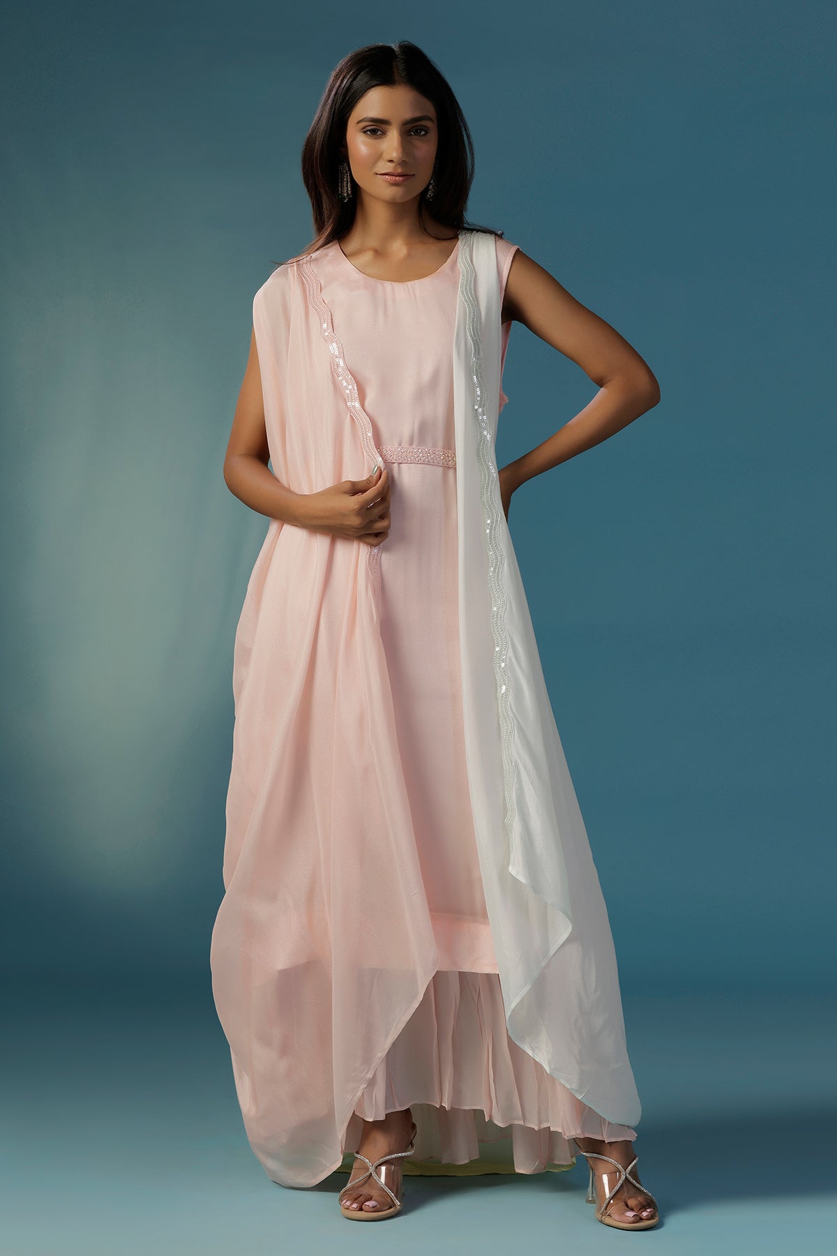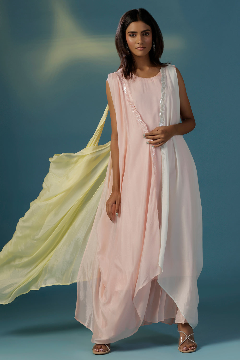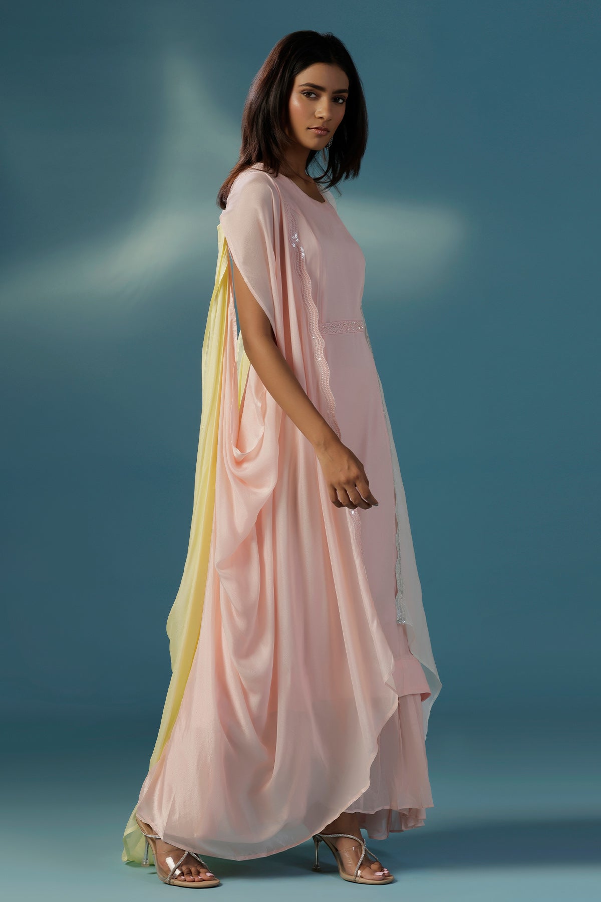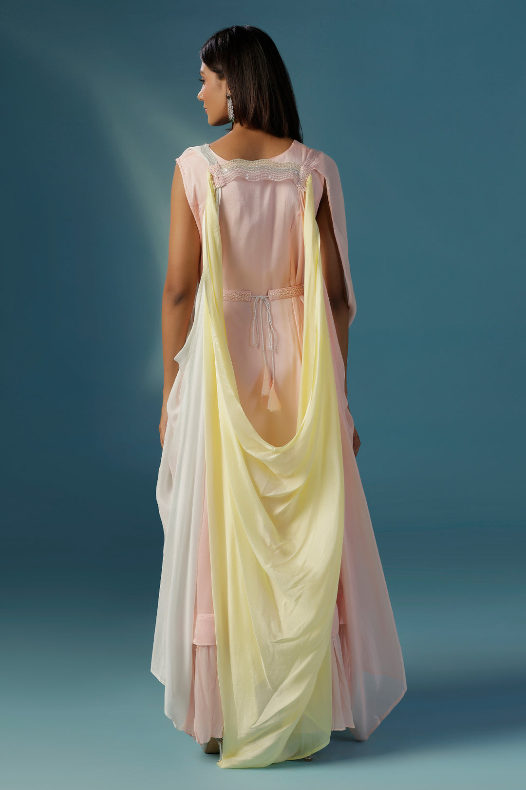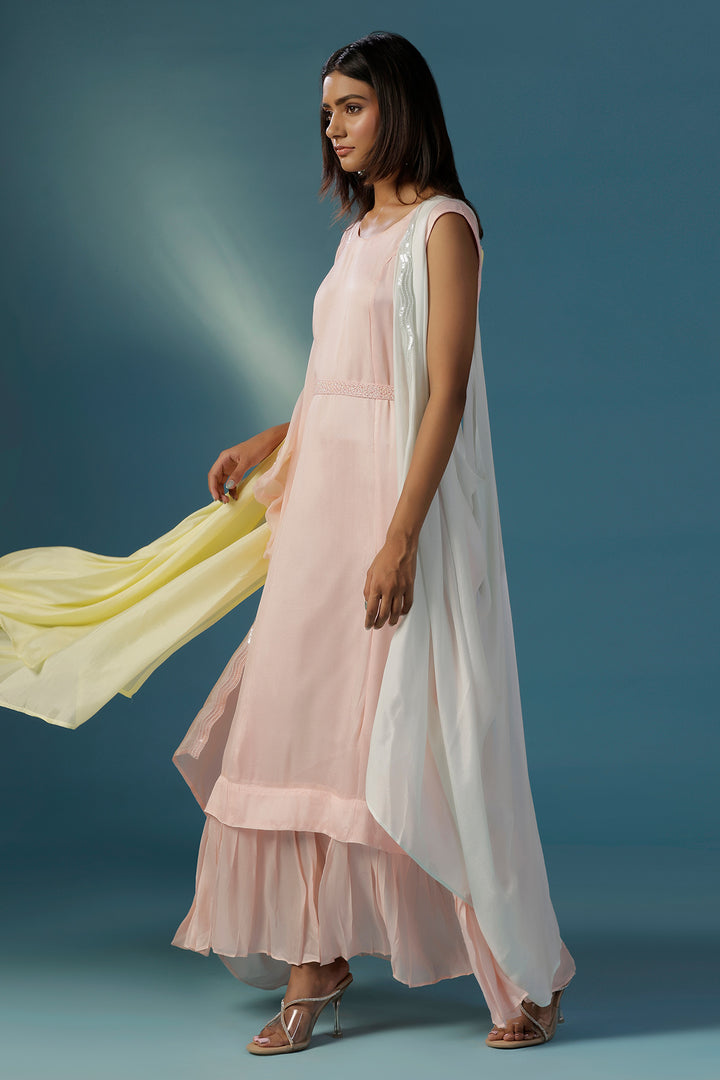 Step into style with this stunner in all things pastel. A soft pink one peice comfortable dress is accompanied by an ultimate dramatic cape that beautifully blends shades of pink and yellow in a flowing cowl drapes. Crafted from gossamer like crepe, this standout piece gives the effect of a striking ombré, it is enhanced with same coloured thin sequin-embellished borders that add just a hint of sparkle. Designed for the modern woman who loves to experiment with style, this cape set is perfect for sundowners, destination weddings, cocktails and brunches alike. Raise a toast in style thats purely you.