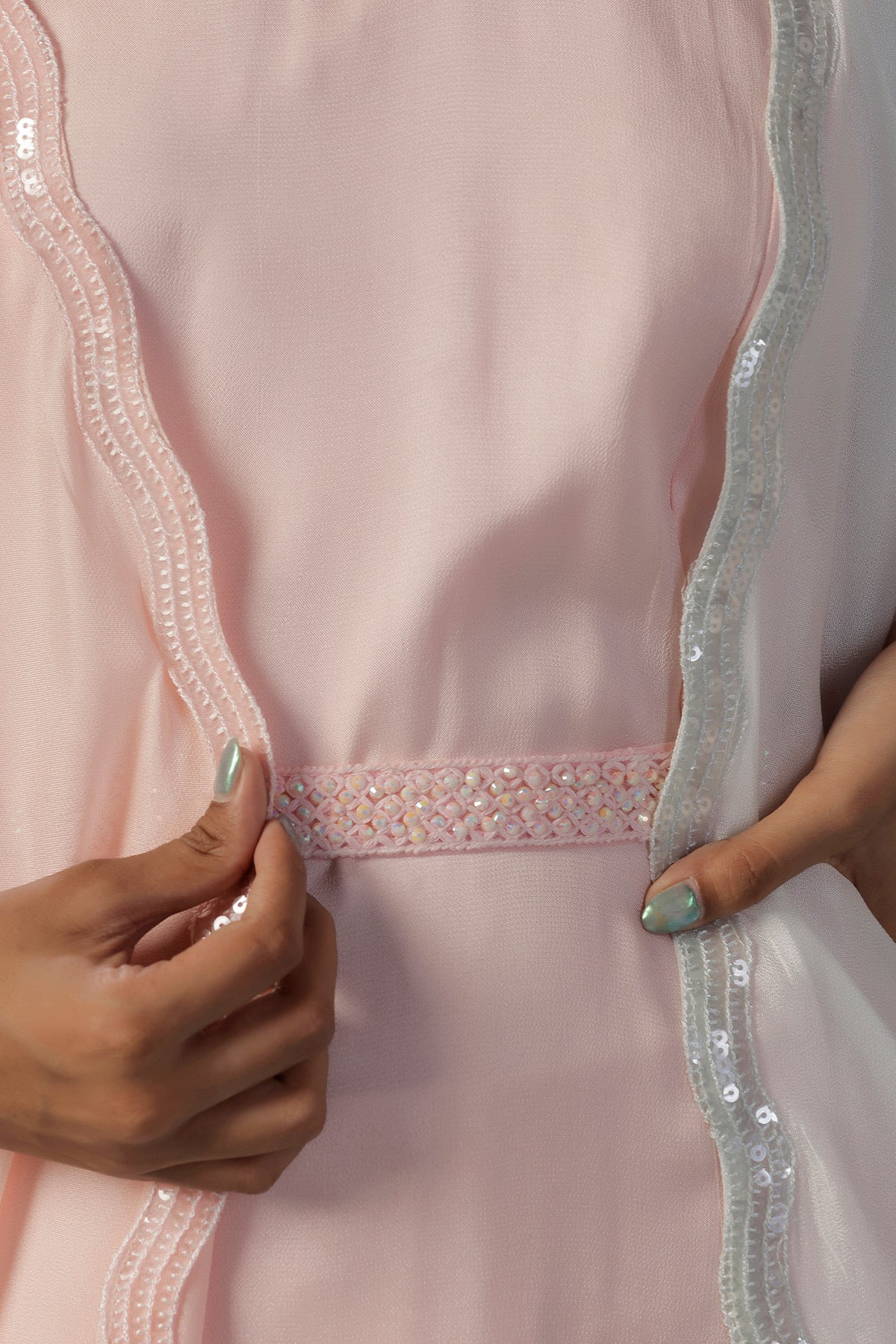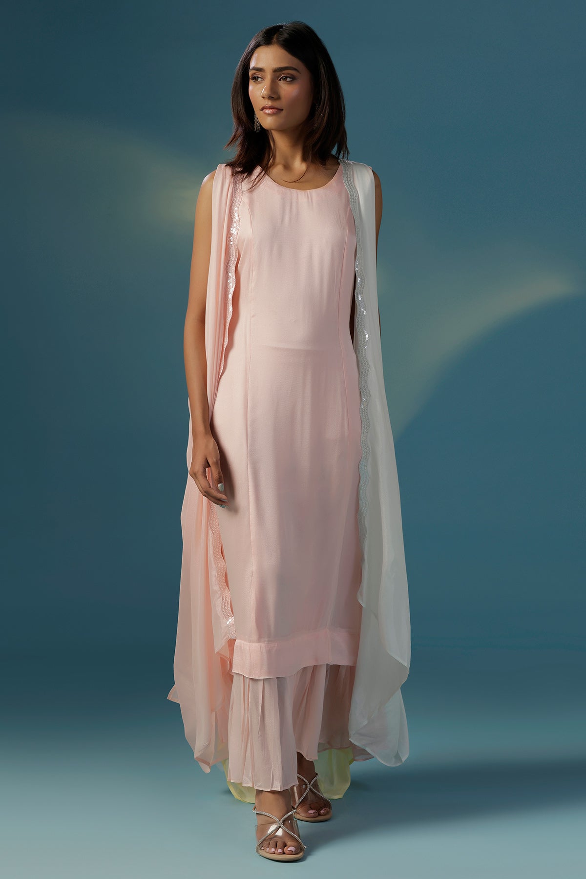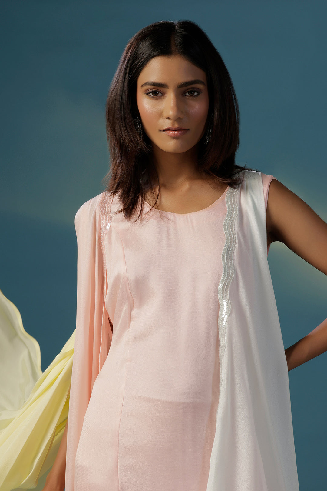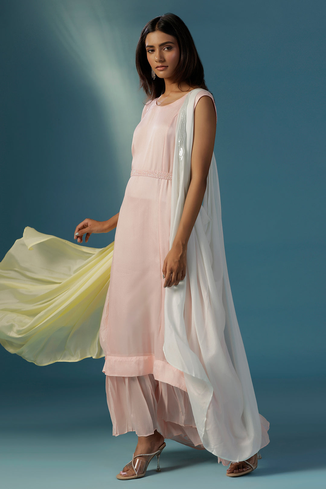 Step into style with this stunner in all things pastel. A soft pink one peice comfortable dress is accompanied by an ultimate dramatic cape that beautifully blends shades of pink and yellow in a flowing cowl drapes. Crafted from gossamer like crepe, this standout piece gives the effect of a striking ombré, it is enhanced with same coloured thin sequin-embellished borders that add just a hint of sparkle. Designed for the modern woman who loves to experiment with style, this cape set is perfect for sundowners, destination weddings, cocktails and brunches alike. Raise a toast in style thats purely you.