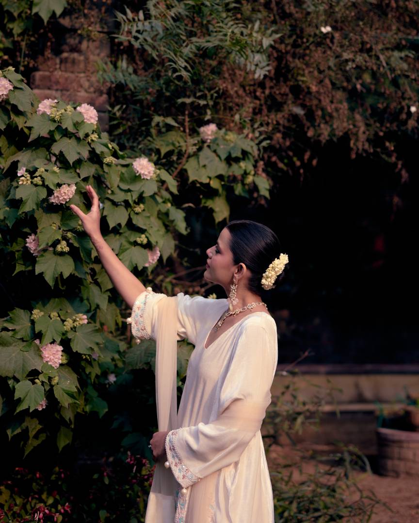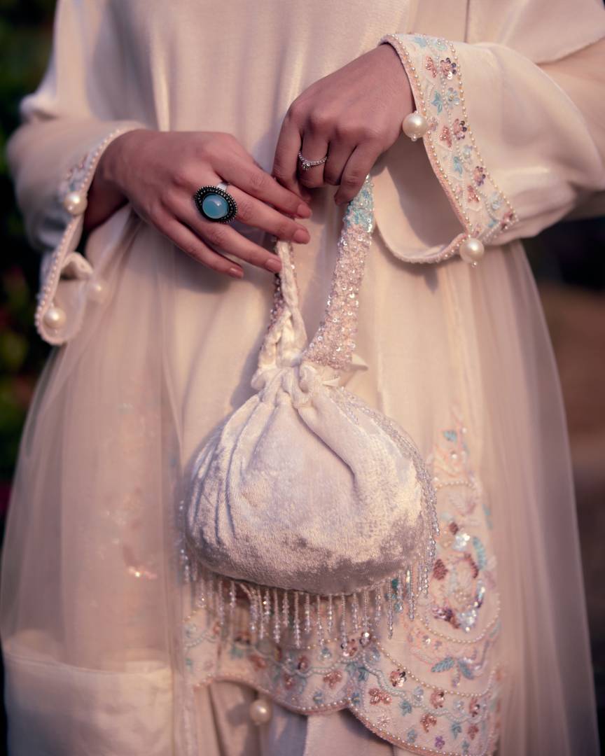 Embrace ethereal elegance in this stunning off-white velvet ensemble. The relaxed short kalidar kurta features a glass neckline with delicate pastel floral embroidery adorning the hemline and sleeves in soft pink, blue, and gold. Pearl embellishments add exquisite finishing touches throughout. Crafted in luxurious velvet with no lining, it pairs with matching salwar and an elegant net dupatta finished with velvet borders and pearl detailing. Includes a matching potli with pearl tassels.