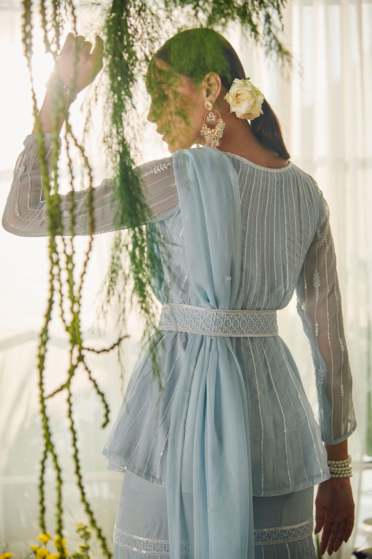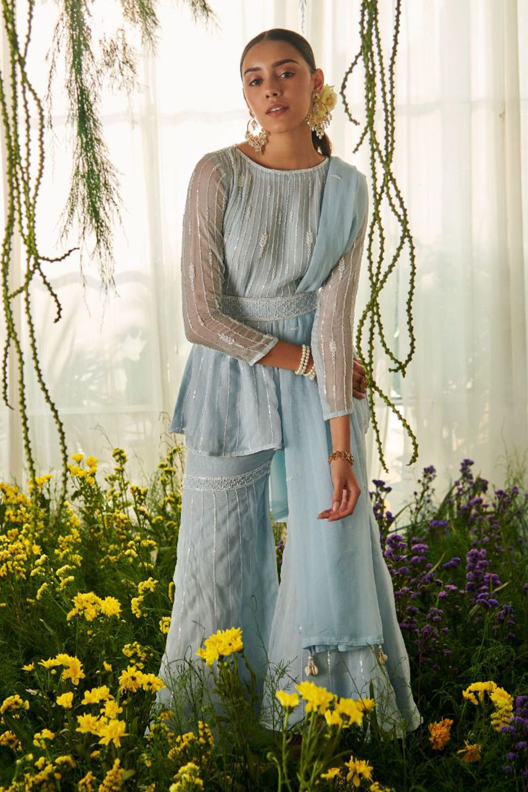 This powder blue gharara set is crafted entirely from georgette and is adorned with modern cutdana lines for a contemporary touch. The peplum top features delicate embellishments and an embroidered belt, adding structure and elegance. The flowy georgette gharara bottom enhances the silhouette with its graceful drape. A matching georgette dupatta, beautifully embroidered, completes the look with sophistication. Perfect for all kinds of festive occasions, this ensemble is a timeless statement of grace for all ages.