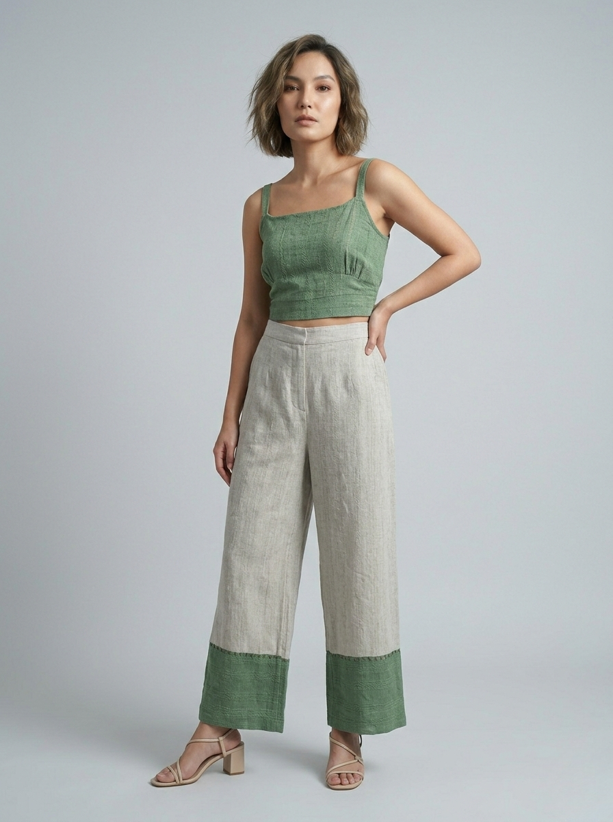 Embrace texture with this minimalist coordinate set. Crafted from breathable, hand-loomed jute, the outfit highlights clean lines and a bold color-blocked hem. It’s a perfect fusion of raw organic materials and contemporary urban style.